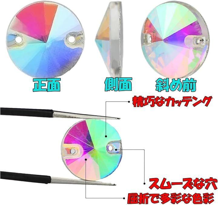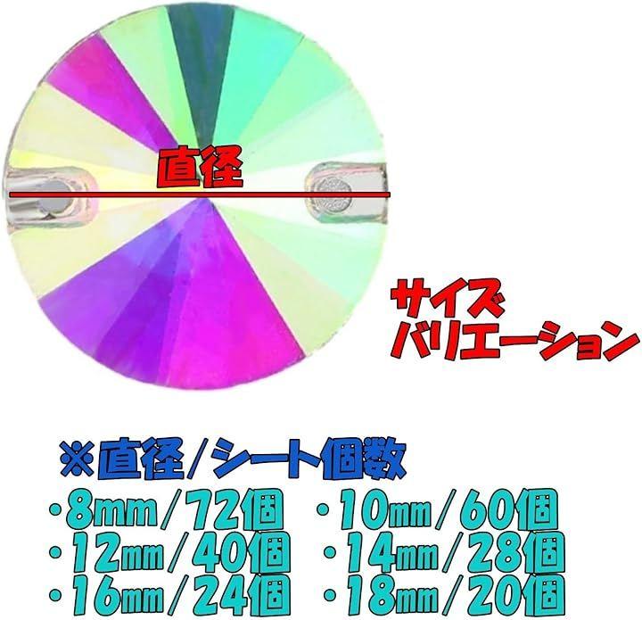 「素材」ガラス「色」AB彩、オーロラ 「タイプ」ソーオン、縫い付け用両端穴2つ「形状」丸形 「販売単位」各サイズ別トレー1つで販売(トレー内の個数はサイズ別)