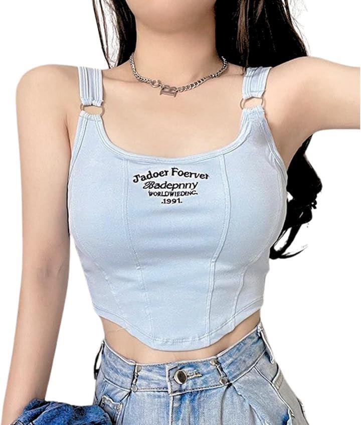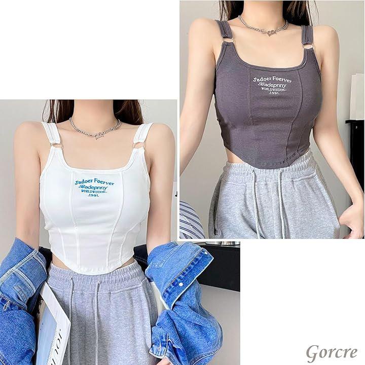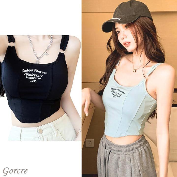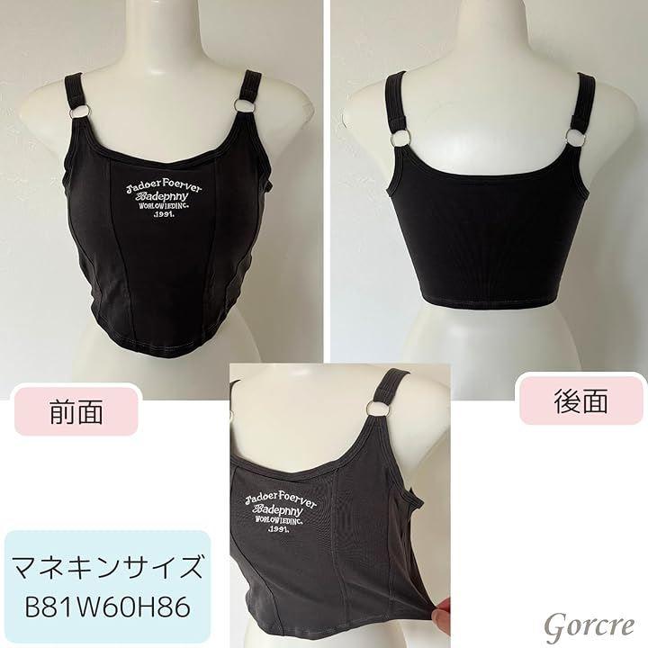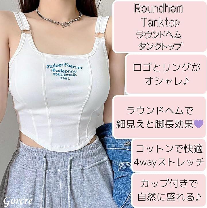 フロントの刺繍ロゴがお洒落なタンクトップです。ラウンドヘムにショート丈で細見えで、脚長効果ありのお洒落トップスです。
