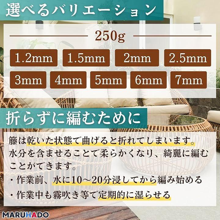 「内容」各サイズ約250g分 「材質」天然籐(丸芯) 「注意点」*ご使用前に水やぬるま湯に10~20分程度浸すと柔らかくなり、折れずに編みやすくなります。