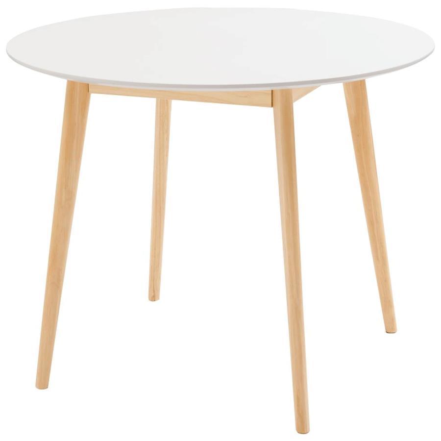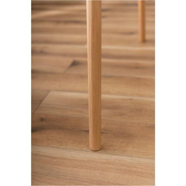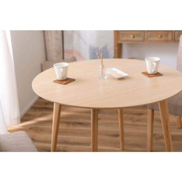 ●インテリア性の高い、コンパクトタイプのラウンドテーブル。●北欧風テイストの脚がハの字に広がるスッキリとしてデザインなので、どんな種類のチェアとも組み合わせやすいテーブル。●天板下の幕板は天板の反り止めや脚のグラつきを最大限抑え、テーブル全体に安定感を持たせてくれます。●ホワイト・ナチュラルどちらも、天板の表面は凹凸のない木目調仕上げ。●小口部分はデザイン性の高い船底形状。シャープですっきりとした印象なので、木製チェアからスチール素材を使ったチェアまで幅広く合わせられます。●脚裏にはフェルトが付いているので、床への傷防止にもなり安心です。
