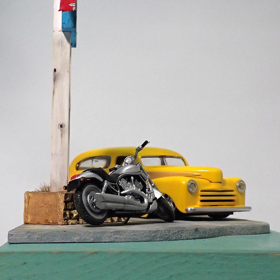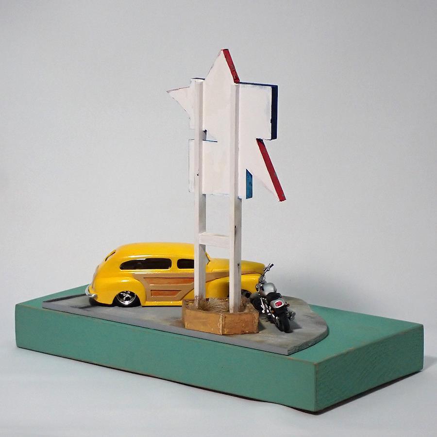 It is a stylishly illustrated diorama of cars and motorcycles stopping by Roy's Motel and Cafe.