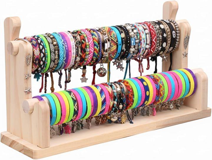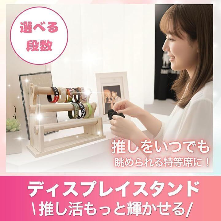 「大切なコレクションが一目で見つかる、美しいディスプレイ収納」推しグッズやお気に入りのアクセサリーが散らばって困っていませんか?この3段木製スタンドなら、ラバーバンドからブレスレットまで種類別にきれいに整理できます。