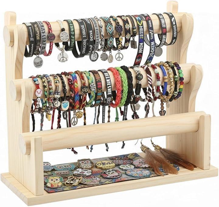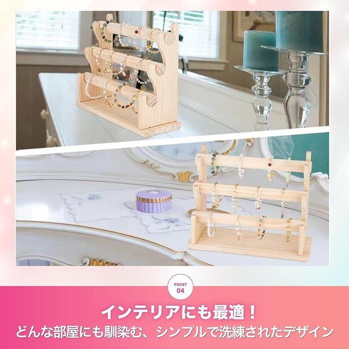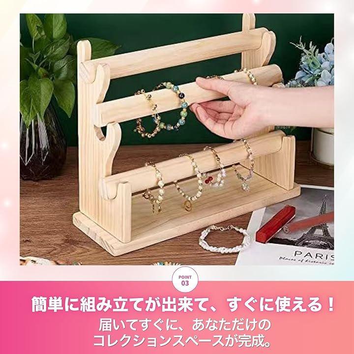 「大切なコレクションが一目で見つかる、美しいディスプレイ収納」推しグッズやお気に入りのアクセサリーが散らばって困っていませんか?この3段木製スタンドなら、ラバーバンドからブレスレットまで種類別にきれいに整理できます。