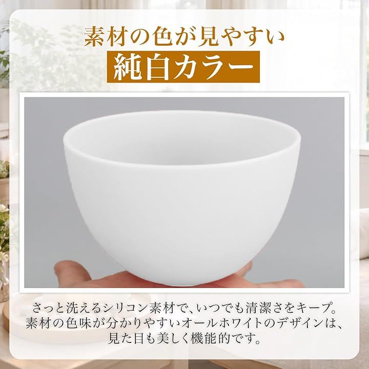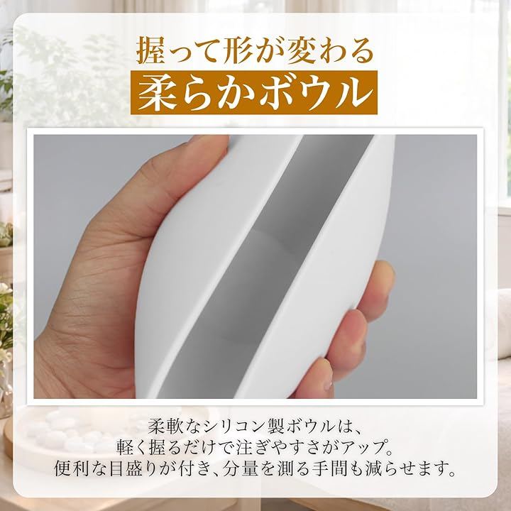 「柔らか素材で注ぎやすく計量もラク」 柔軟なシリコン製ボウルは、軽く握るだけで注ぎやすさがアップ。
