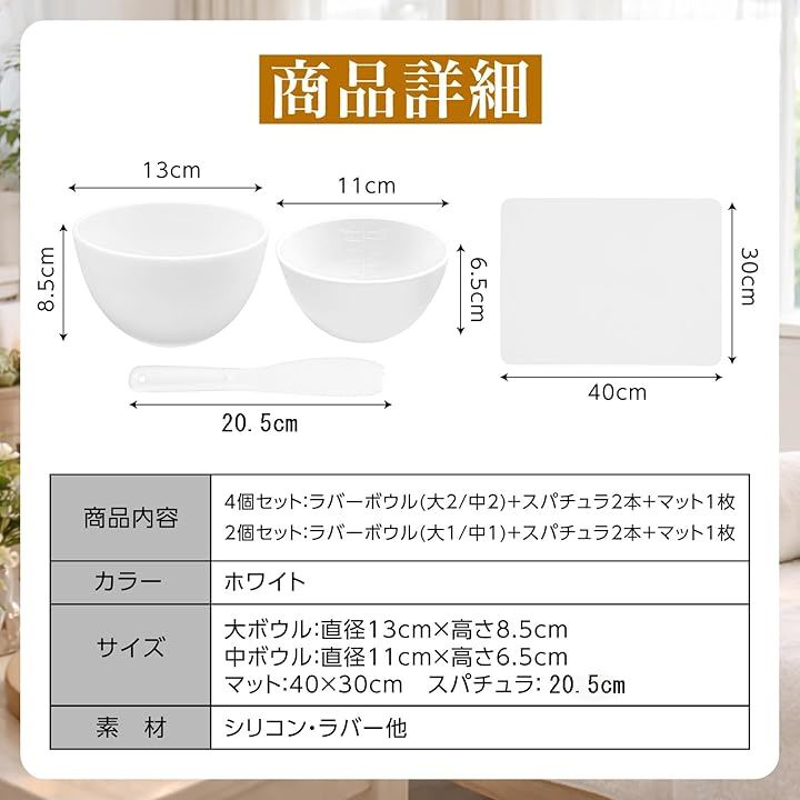 「商品内容」4個セット:ラバーボウル(大2/中2)+スパチュラ2本+マット1枚、 2個セット:ラバーボウル(大1/中1)+スパチュラ2本+マット1枚「カラー」ホワイト 「サイズ」大ボウル:直径13cmx高さ8.5cm中ボウル:直径11cmx高さ6.5cmマット:40x30cmスパチュラ:20.5 cm「素材」シリコン・ラバー他 *モニターの環境により、色の見え方に若干差が生じる場合がございます。