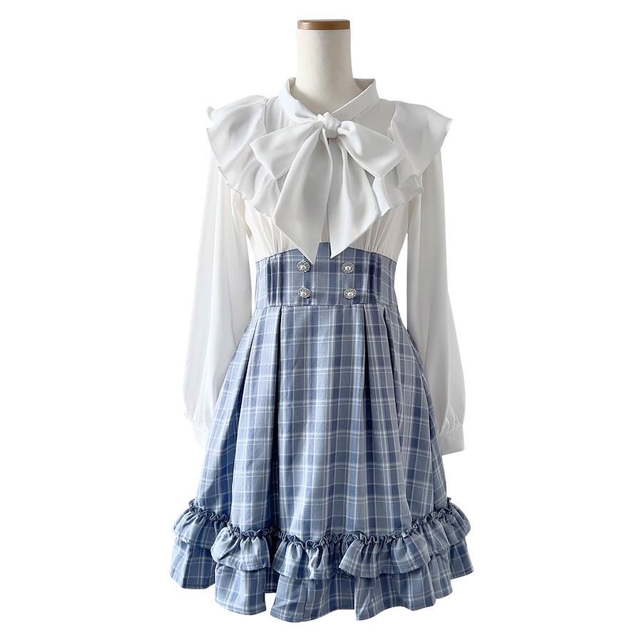 チェックスカートとボウタイブラウスをドッキングした、1枚でコーデが完成するワンピースです。