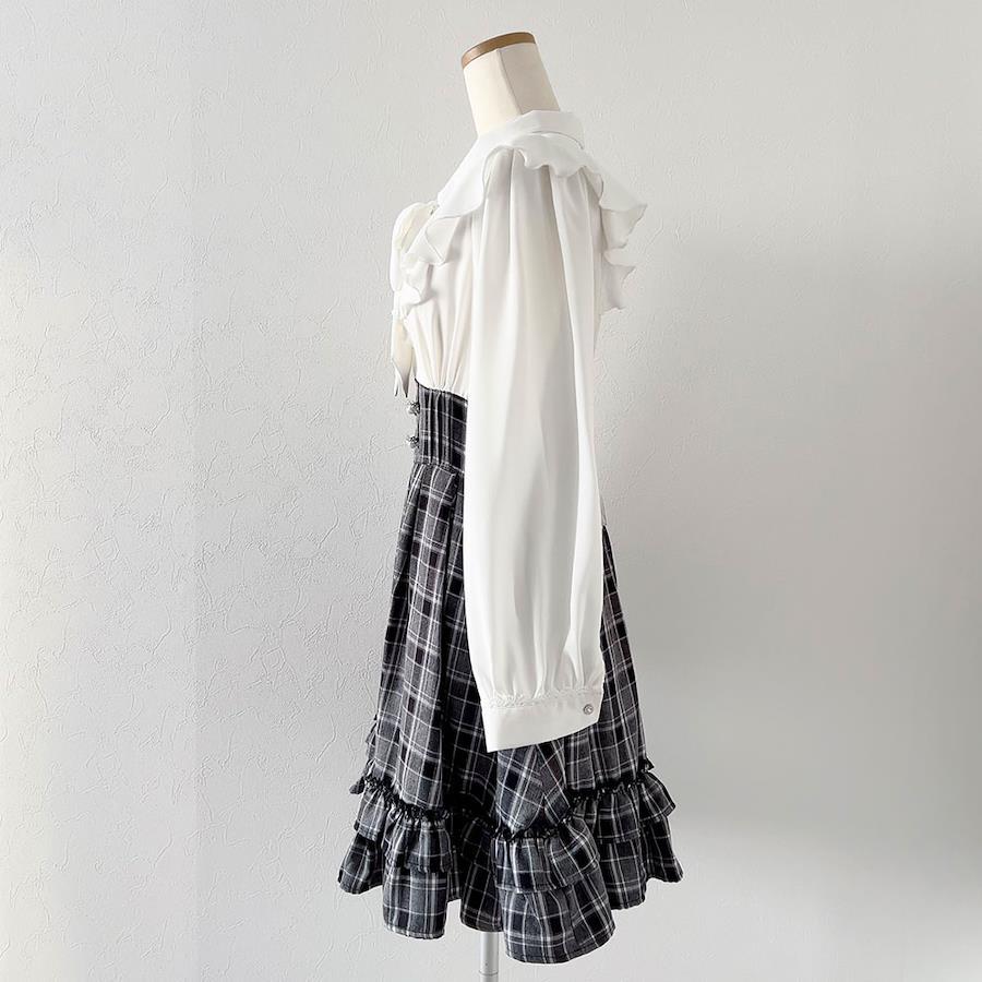 チェックスカートとボウタイブラウスをドッキングした、1枚でコーデが完成するワンピースです。