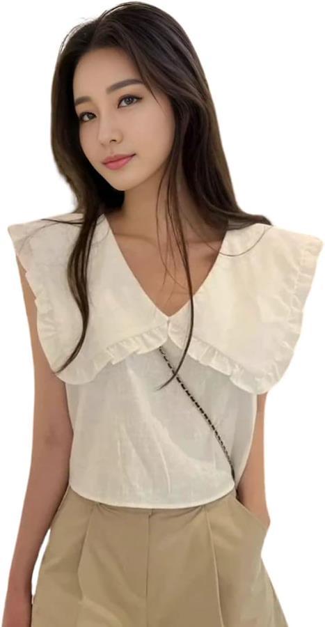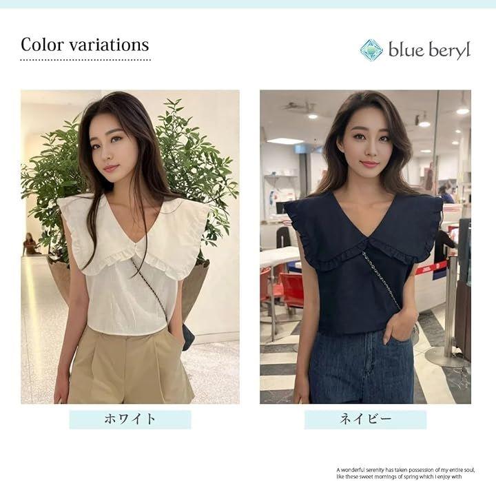 「印象的なフリル襟とバランスのよいノースリーブ」 フロントの大きめフリルカラーは、顔まわりを華やかに見せつつ小顔効果も期待。