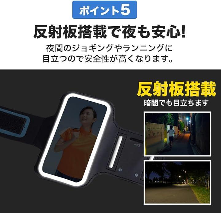 「夜間でも安心な反射板搭載」 夜間のジョギングやウォーキングも安心な反射板付きアームバンド。