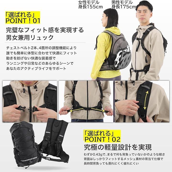 リュックを背負って走るトレイルラン、ロードバイクなどでのサイクリング、日帰り登山でも活躍します。
