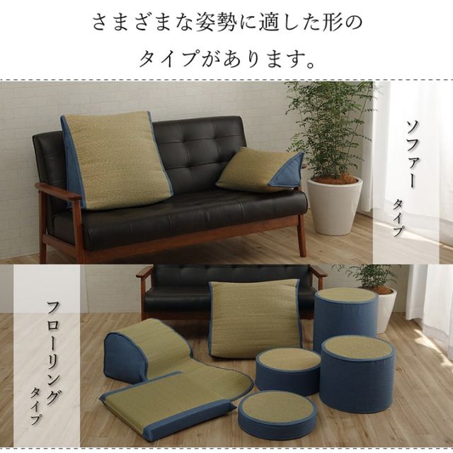 さまざまな姿勢に適した形のバリエーションがあります。おうちでゆっくりくつろぐ際に活躍してくれます。い草には、空気をきれいにする、湿度を整える、高い吸湿性、消臭、汚れにくい、燃えにくい、森林浴効果などの効果があります。