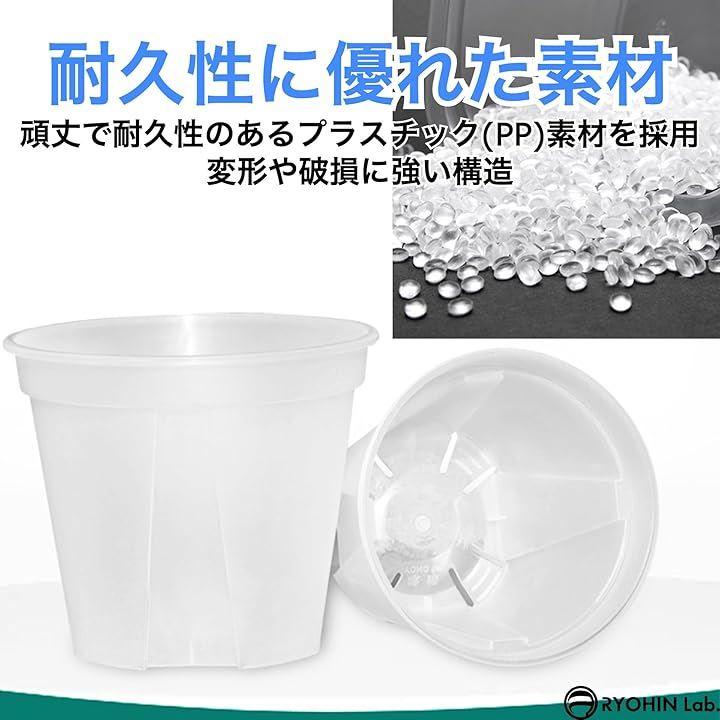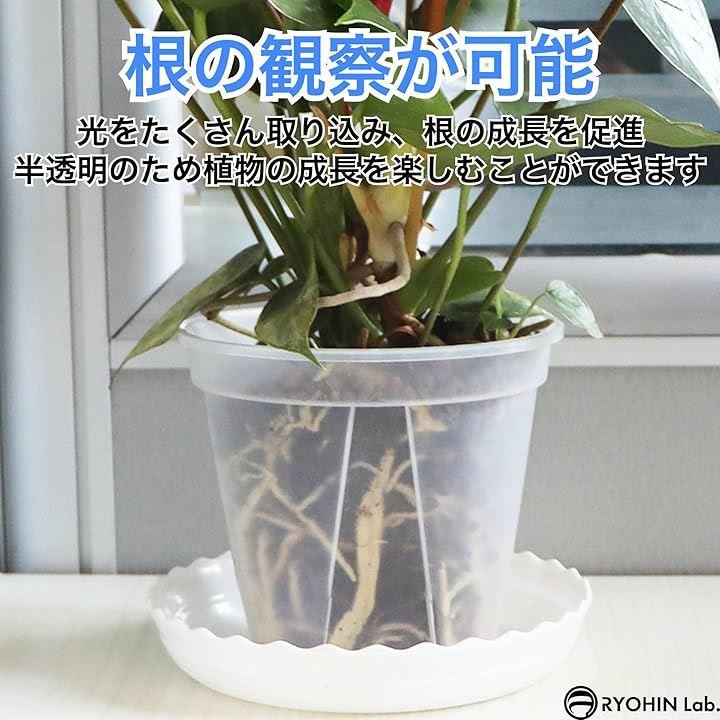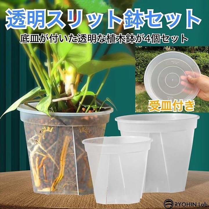 「商品内容」スリット鉢+受け皿 4個セット、バリエーション:4号:外径12cm / 底径8.4cm / 高さ10.4cm 、5号:外径14.8cm / 底径10.6cm / 高さ13cm 、6号:外径18cm / 底径12.6cm / 高さ15.3cm 、7号:外径20.8cm / 底径14cm / 高さ20.4cm、カラー:クリア、素材:プラスチック