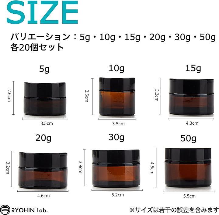 「商品内容」本体:20個セット(中蓋付き)、容器カラー:遮光ブラウン、容量バリエーション:5g, 10g, 15g, 20g, 30g, 50g