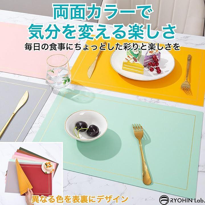 「商品内容」リバーシブルランチョンマット4枚セット、サイズ:約43cmx30cmx0.2cm、カラーバリエーション:10種類(ブラック・レッド/ピンク・パープル/ブラウン・グレー/ネイビー・イエロー/レッド・イエロー/パステルピンク・スカイブルー/イエロー・グレー/グレー・アイボリー/ミントグリーン・スカイブルー/グリーン・グレー)、重量:145g/枚、素材:PUレザー、耐熱温度:上限100℃