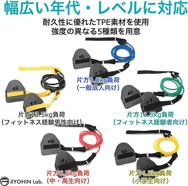 「商品内容」水泳用トレーニングチューブ、[負荷別バリエーション]イエロー:片方4.5kg負荷タイプ(小学生向け)・レッド:片方6.5kg負荷タイプ(中高生向け)・ブルー:片方9.0kg負荷タイプ(一般成人向け)・グリーン:片方11.5kg負荷タイプ(フィットネス経験者向け)・ブラック・イエロー:片方13.5kg負荷タイプ(フィットネス経験男性向け)