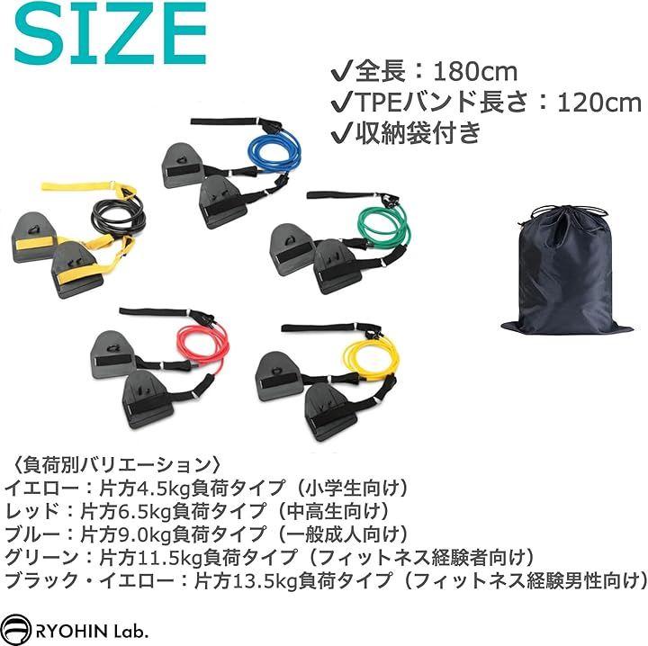 「商品内容」水泳用トレーニングチューブ、[負荷別バリエーション]イエロー:片方4.5kg負荷タイプ(小学生向け)・レッド:片方6.5kg負荷タイプ(中高生向け)・ブルー:片方9.0kg負荷タイプ(一般成人向け)・グリーン:片方11.5kg負荷タイプ(フィットネス経験者向け)・ブラック・イエロー:片方13.5kg負荷タイプ(フィットネス経験男性向け)