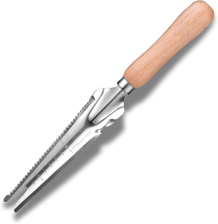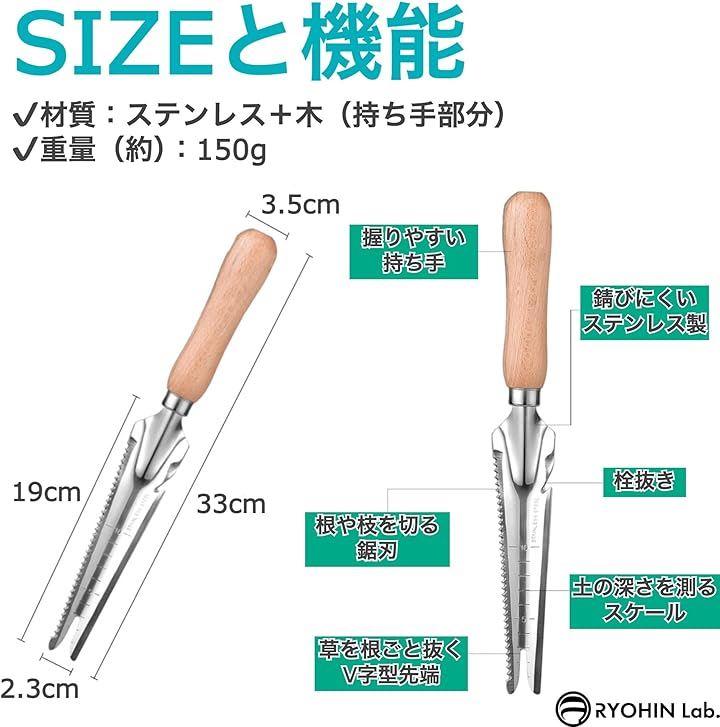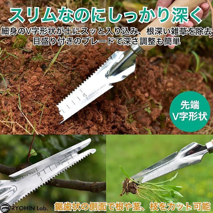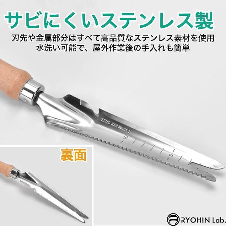 鋸歯状の側面で根や茎をカットし、目盛り付きのブレードで深さ調整も簡単。