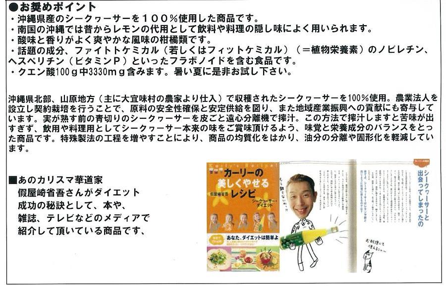 沖縄県産100%のシークヮーサーを皮ごと搾った、100%ジュースです。カリスマ華道家「假屋崎省吾」さんが、自身の料理本や、料理番組出演時に、紹介している商品です。今話題の、ノビレチン、ヘスペリジンと言った植物栄養素(ファイトケミカル、フィットケミカル)を簡単に摂取できます。お水やソーダで割って、8~15倍で、ジュースとしてお飲み頂けます。レモンや、ゆずの代わりに、お料理にもどうぞ。(オリーブオイルとの相性抜群です。白身魚や、帆立を、マリネすると美味しいカルパッチョが出来ます。)