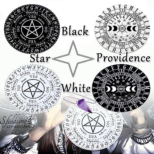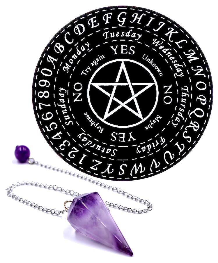 ダウジングチャートと、アメジストの水晶が付いた美しいペンデュラム振り子のセット。チャートシートのカラーはブラックとホワイト、柄はスター(ペンタグラム)とプロビデンスからお選びいただけます。ダウジングや占いにご使用いただけます。 誰にも言えない悩みがある、決断を誰かに後押ししてほしい、未来が不安で仕方ない、そんな時はペンデュラムに質問しましょう。あなた自身が持つ特有の波動を、ペンデュラムの波動に合わせ、一心同体に心を通わせます。 ダウジングチャートは、振り子を使用する際に置かれるマットで、占いやダウジングの作業をサポートするための目印となります。エネルギーや情報を感知するために使用されるシートです。 水晶は、エネルギーの受容や調整に使用されるパワーストーンです。一般的には、重りがついたチェーンや紐が振り子として使われますが、こちらのアメジスト水晶付きペンデュラム振り子を握り、エネルギーの流れを感じて質問に答えてください。 【サイズ】ダウジングチャートシート:直径25cm×厚さ3mm / 水晶 アメジスト:3cm / チェーン:25cm