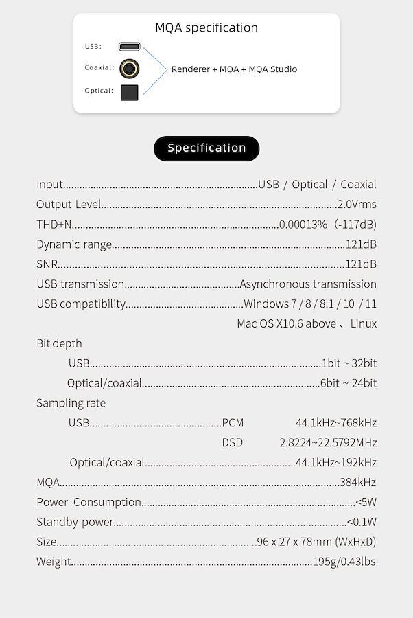 サンプリングレート:USB PCM 44.1KHZ-768KHz/DSD 2.8224-22.5792MHz