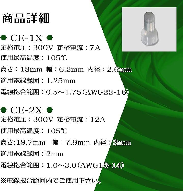 「CE-1詳細」高さ:18mm、幅:6.2mm、内径:2.6mm、適用電線範囲:1.25mm2(1袋1000個入り) 「CE-2詳細」高さ:19.7mm、幅:7.9mm、内径:3mm、適用電線範囲:2mm2(1袋1000個入り)