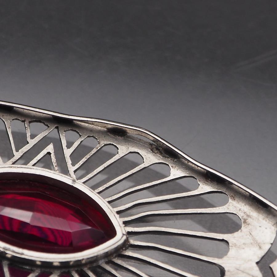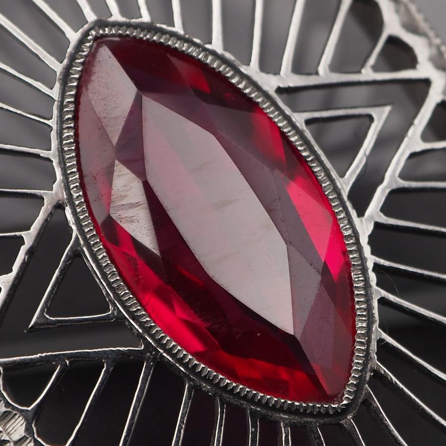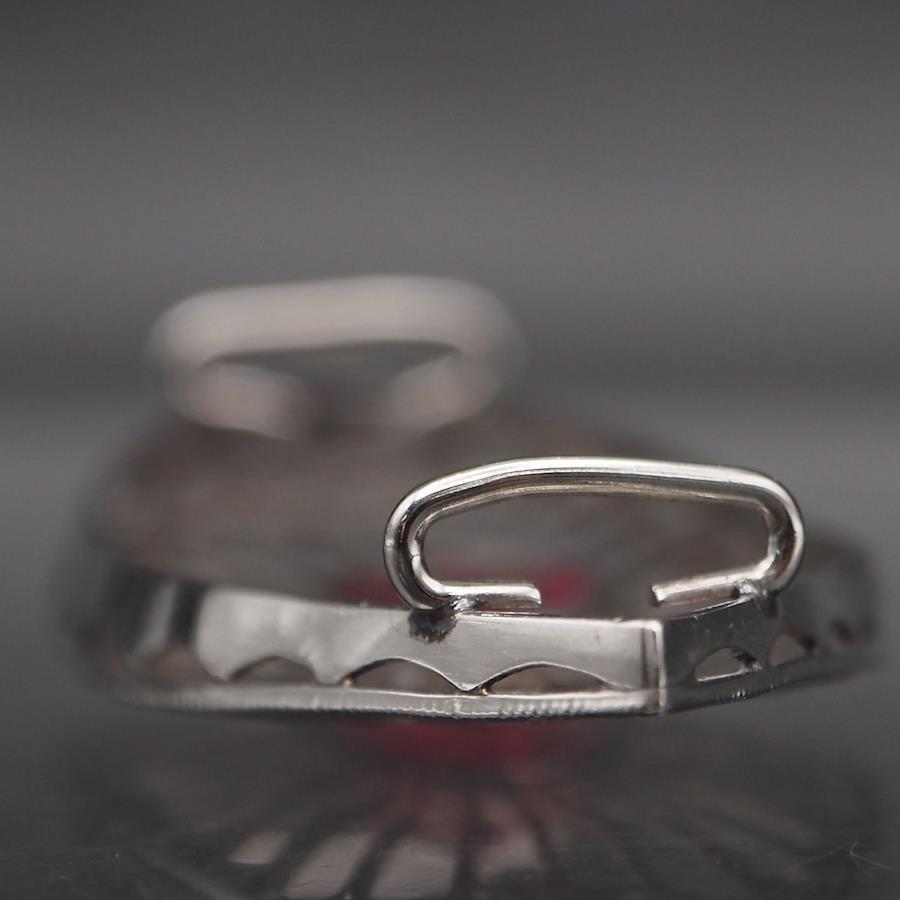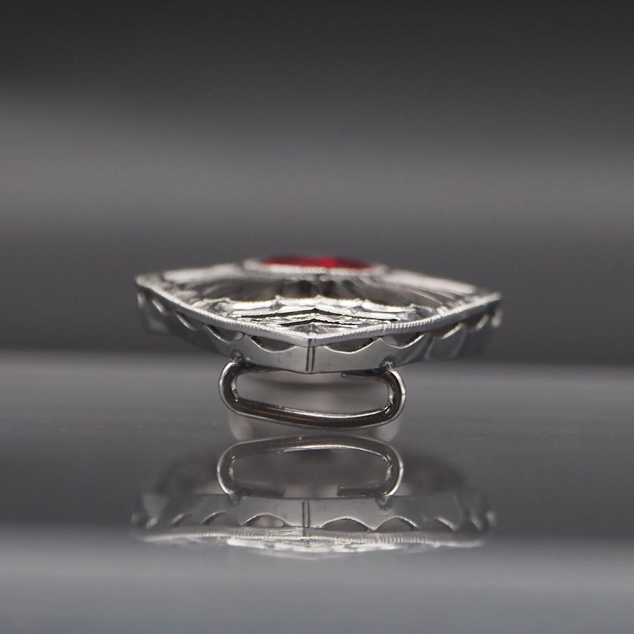 S426 Ruby? Pink Spinel? Obi-dome (kimono sash clip) with openwork design, silver color, Japanese style accessory.