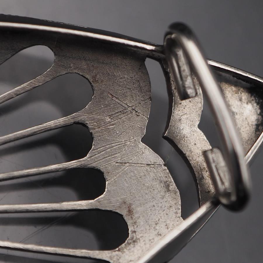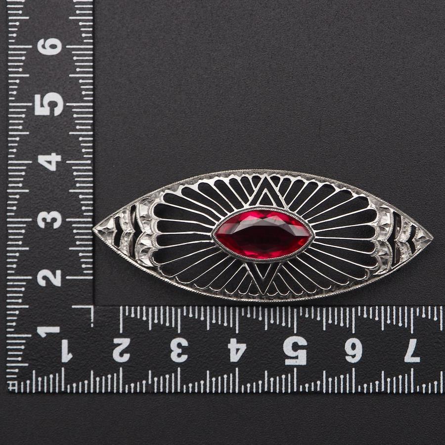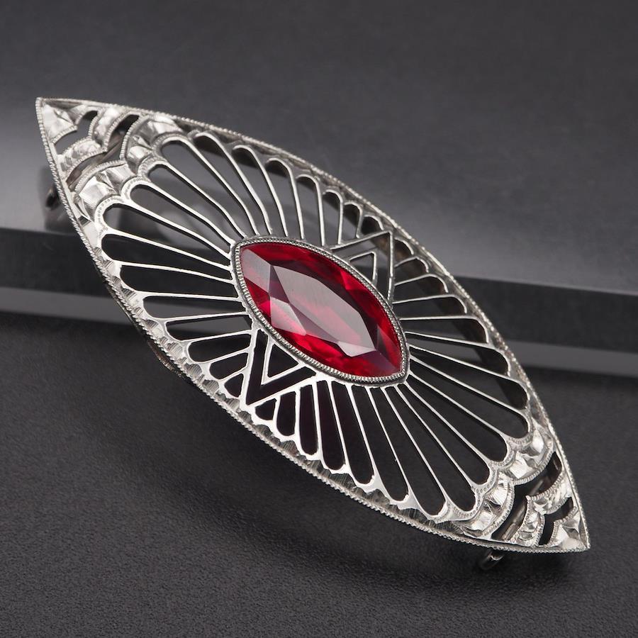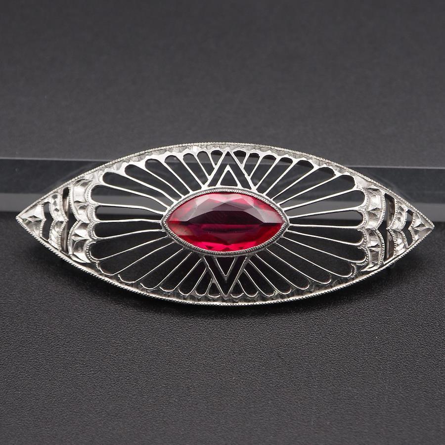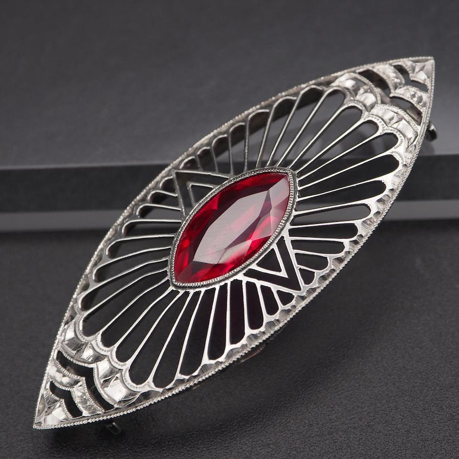 S426 Ruby? Pink Spinel? Obi-dome (kimono sash clip) with openwork design, silver color, Japanese style accessory.