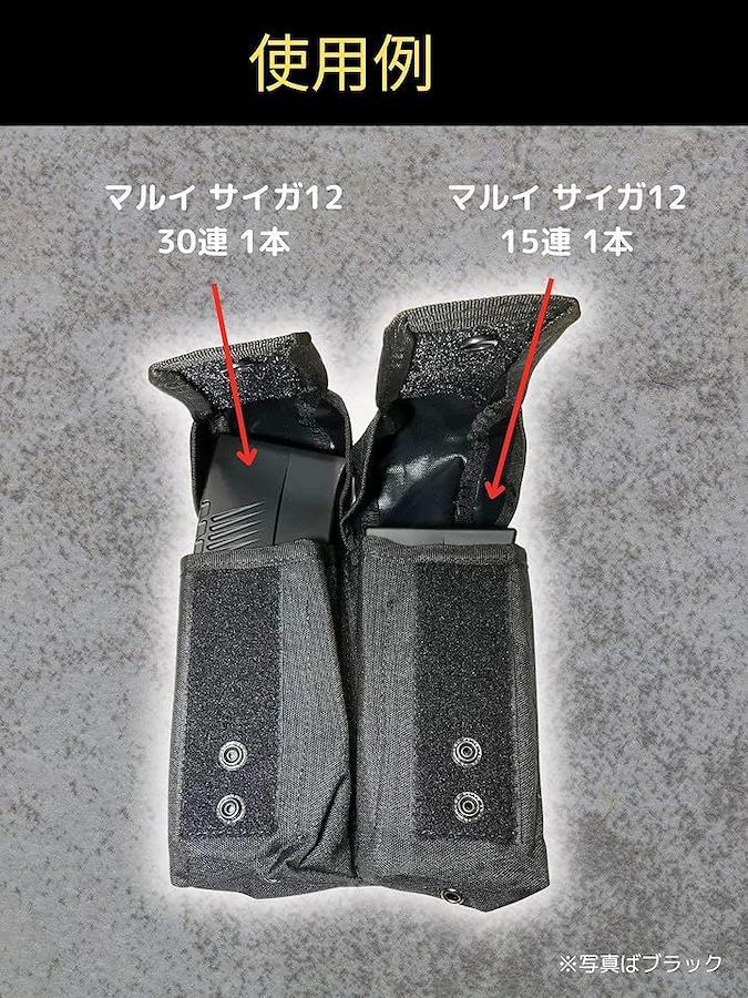 「サイガ12・AKマガジン対応 – 拡張性の高い設計」本製品は、サイガ12(Saiga-12)ショットガン用マガジンを1本x2(計2本)、AK系(AK47、AKMなど)の7.62mmマガジンを2本X2(計4本)収納可能な専用ポーチです。