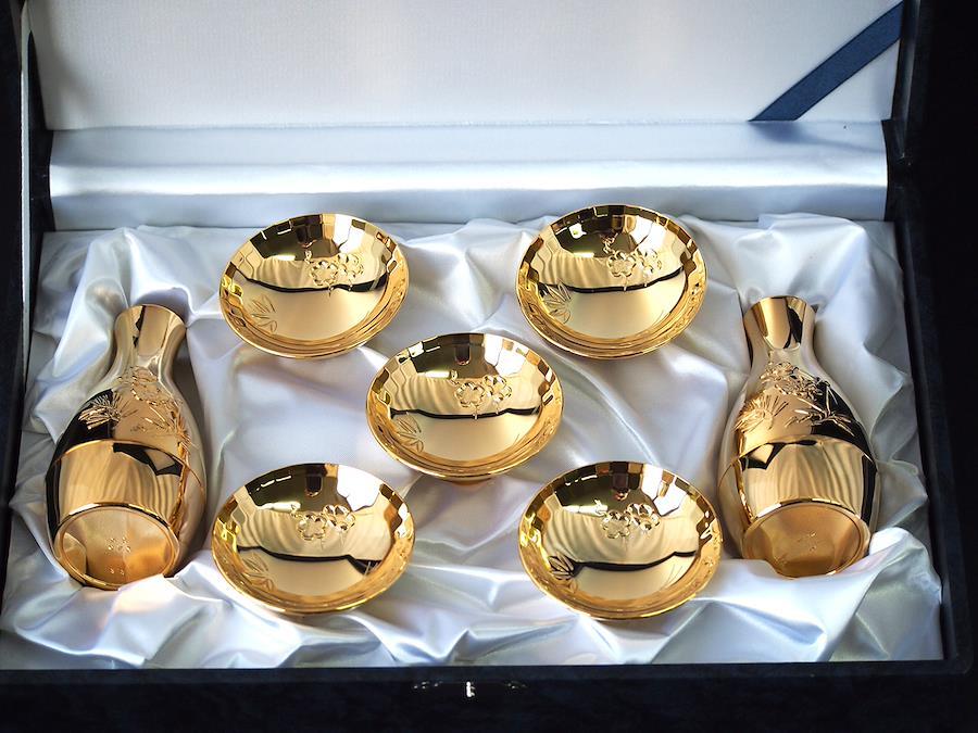 内装がサテン生地のケースに、金メッキ仕上げが施された徳利×2個と盃×5個が入っています。