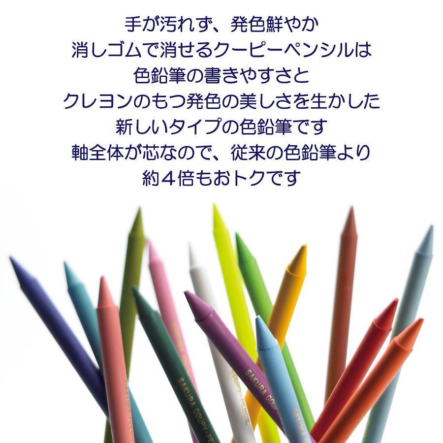 色鉛筆の書きやすさと、クレヨンの持つ発色の美しさを生かした新しいタイプの色鉛筆。消しゴムで消せる。軸全体が芯になっているため、芯の容量は従来の色鉛筆の約4倍となって経済的。【用途】社会科の地図の色分け、生活科で観察記録・絵地図、理科では植物の観察記録、算数でグラフなど、小学生の学習に。幼児のお絵描きから、多彩な技法や表現を活かして大人の塗り絵などにも。