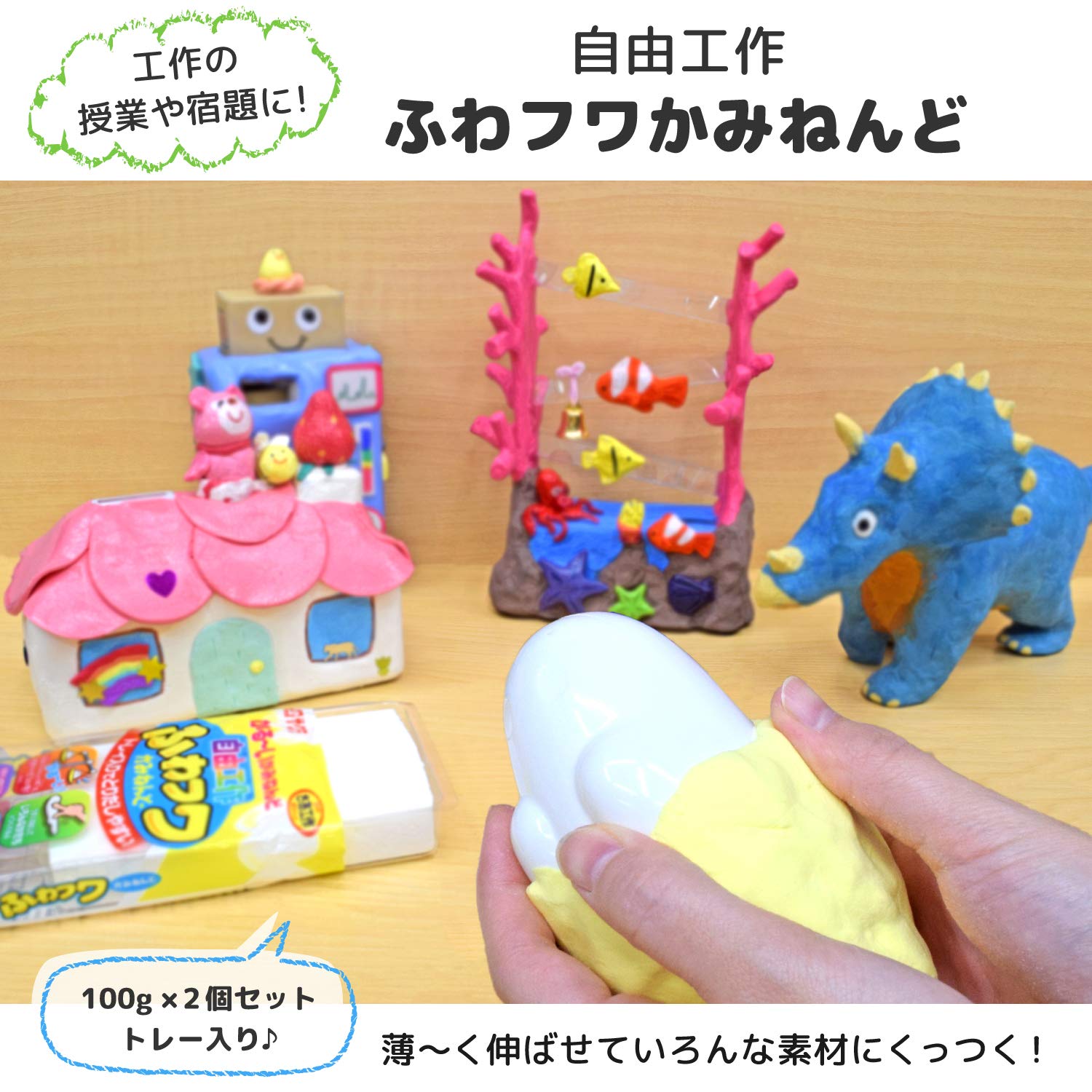 【仕様】袋から取り出しやすいトレイ入り 【特長1】やわらかく手につきにくいなめらかな手触り 【特長2】絵の具を練りこめばカラーねんどとして使える 【単品重量】100g/個 【入数】2個入り
