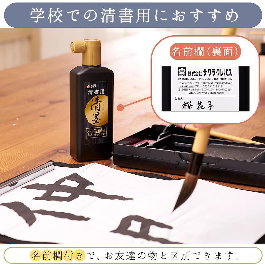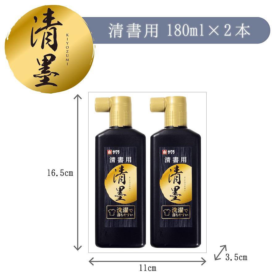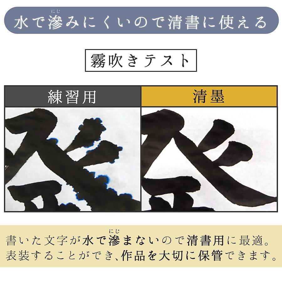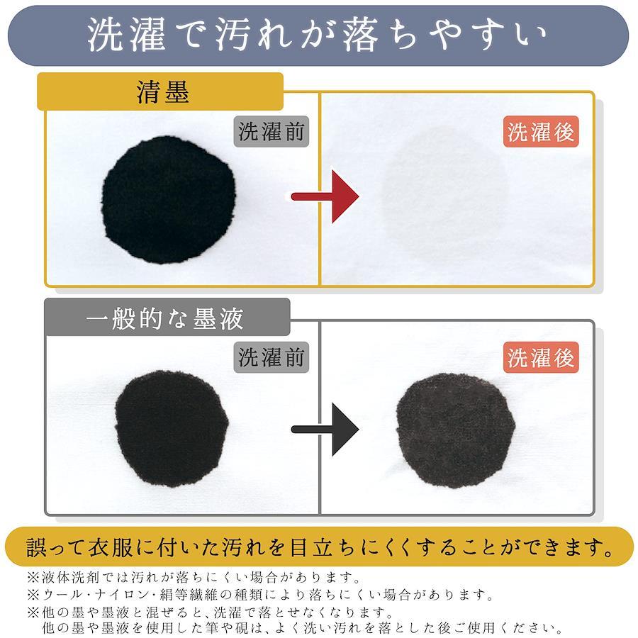 【清墨の特長】誤って衣服などを汚しても、洗濯で目立たなくできる【推奨洗濯方法】粉末洗剤もしくは洗濯用固形石鹸を溶かしたぬるま湯に2時間程度つけ置きして汚れを落とし、もみ洗いした後、本洗いする。※推奨している洗濯方法でも、汚れが「完全に落ちる」ことはありません。予めご了承ください。水で滲まないので表装ができ、清書用として使用することができる。泡の発生しにくい横口容器/墨液が飛び散りにくくなっている。名前欄があるため、持ち主が分かるようになり、学校での使用に適している。