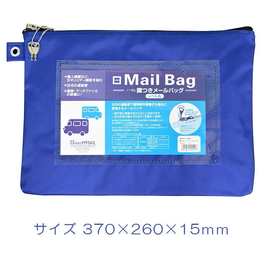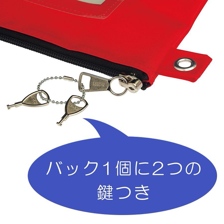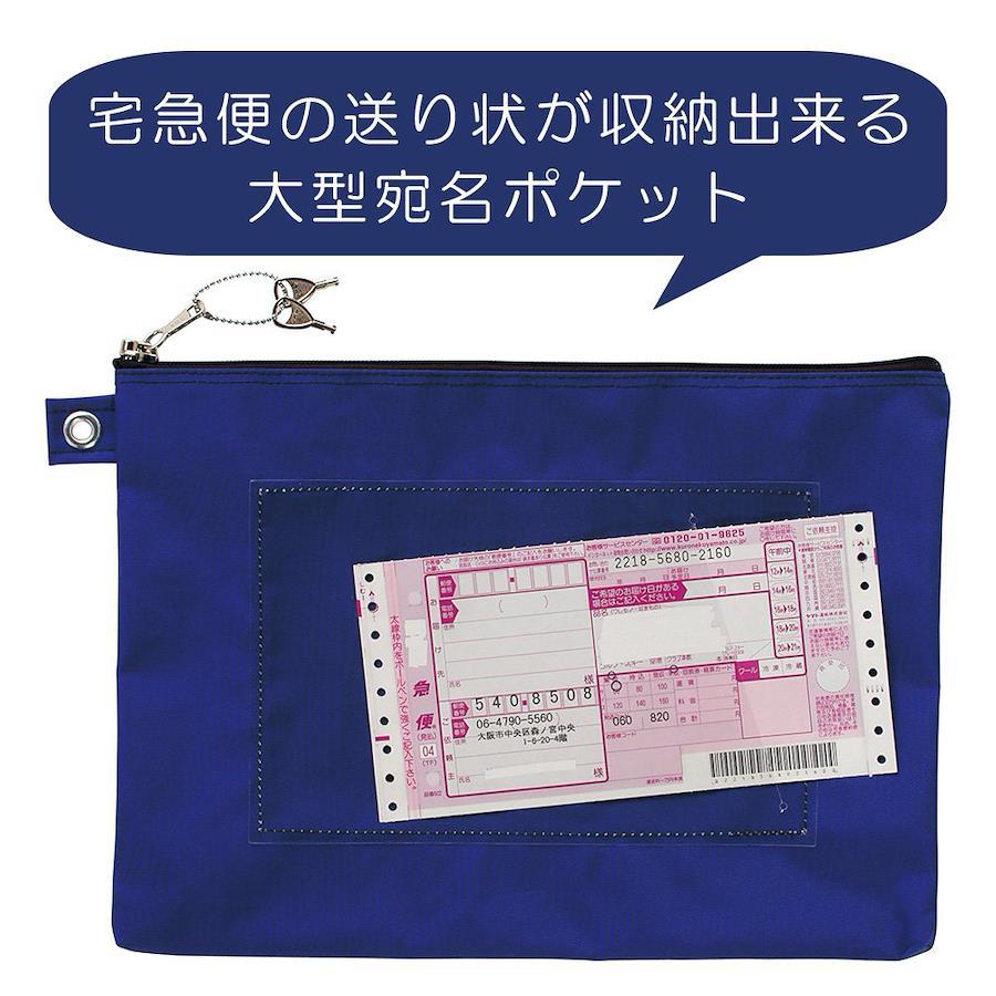 書類移動時に、個人情報が安易に第三者に見られることを防ぐ。ファスナー金具の鍵をかけると通常の方法では開けられない。一般的に社内共有の鍵。鍵は、バッグ1個に2個付。宅急便の送り状が収納できる大型の宛名ポケットになっている。商品サイズ:260 x 370 x 15mm