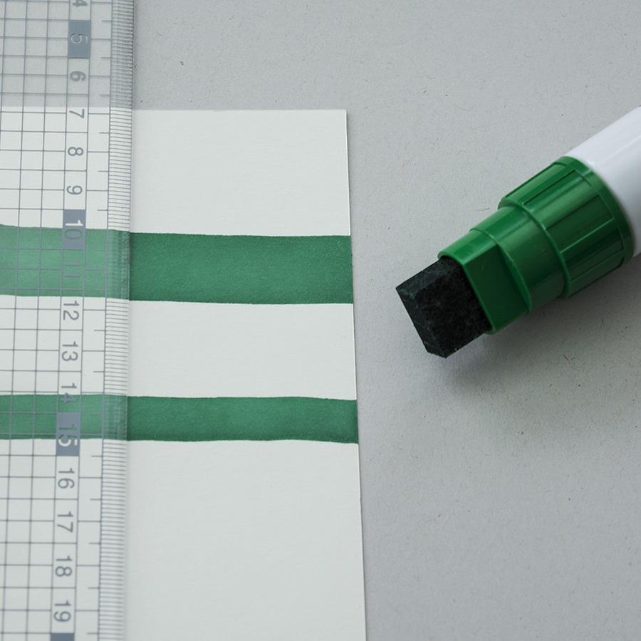 速乾性の強いマーカーで、紙・段ボール・手書きPOPの筆記に適しており、にじみが少なく、鮮やかな発色が得られる。