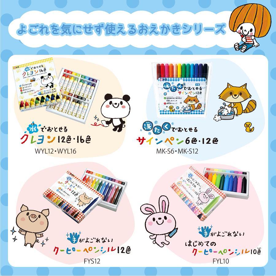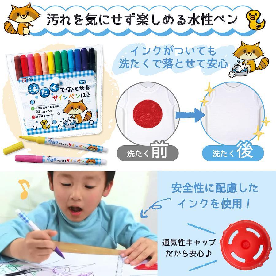 ・インクがついても洗濯でおとせるサインペン12色と、ぬりえができるはがき5枚のセット。