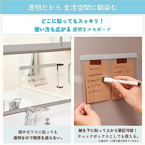 ◎暮らしにとけこむ透明なメモボード・親子の暮らしを応援するために開発された「家事が楽になるシリーズ」から、平らな面にピタっと貼れる透明なメモボード「PitaCLEAR(ピタクリア)」が誕生。・家族間の伝言やメモ書きに。ボードマーカーで書いてキレイに消せる。・繰り返し貼ってはがせる粘着シート式。冷蔵庫など凹凸のない滑らかな平面に貼れる。・透明なので生活空間に馴染み、視界を遮らないので洗面台の鏡やガラスなどにも使える。・紙を下に貼って上から筆記することでチェックボックスとしての使い方もできる(※紙はテープ等で貼り付けて下さい)。・イレーザー付きホワイトボードマーカー細字2本(黒・赤)付き。