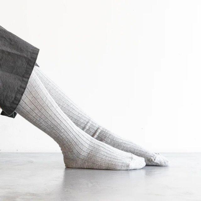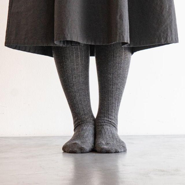 保温性に優れたアクリルウールタイツです。細いリブに比べ、よりカジュアルに履けるよう太めのリブ幅で編み立てました。通常のタイツに比べやや長めの丈にしています。