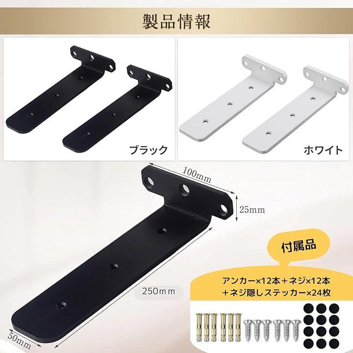 「商品仕様」セット内容:ブラケット本体x4本 ボードアンカーx12本 ネジx12本 ネジ穴ステッカーx24枚、 ブラケット本体サイズ:長さ25cmx幅10cmx高さ2.5cm
