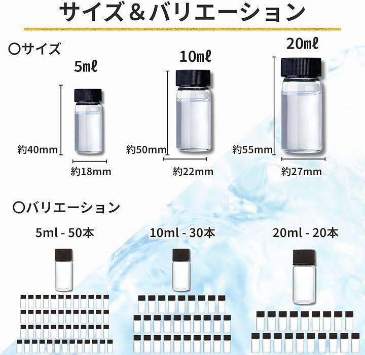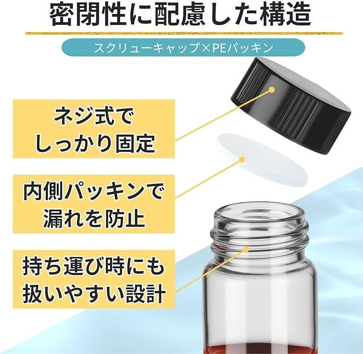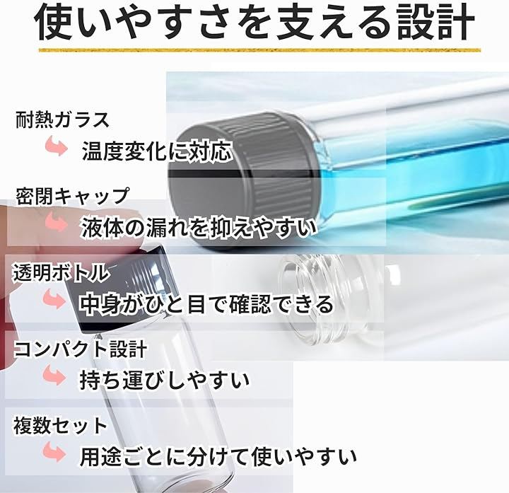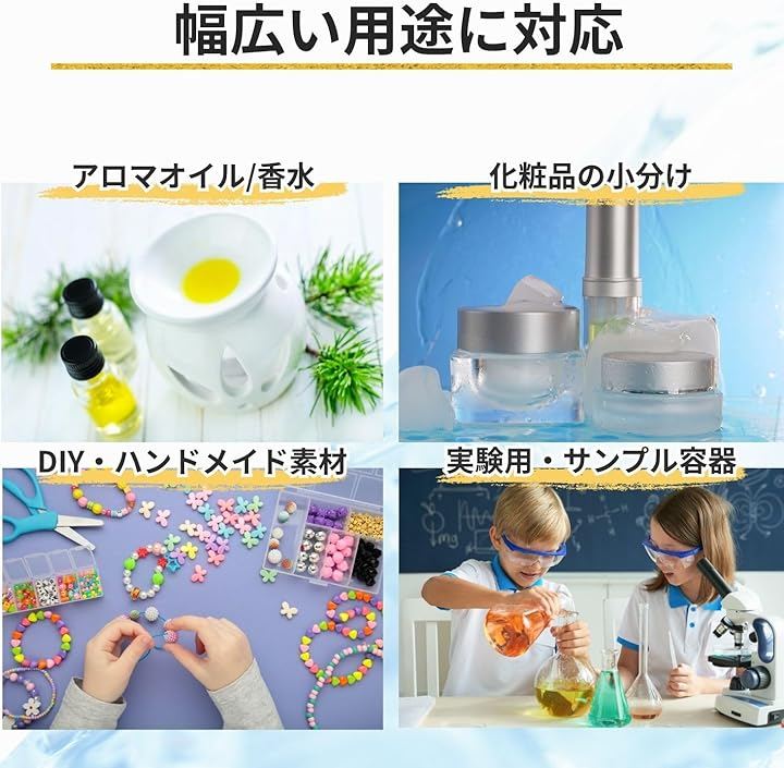 温度変化に強い素材で、アロマオイル、エッセンシャルオイル、香水、化粧水、インク、試薬などの保存容器として使用できます。
