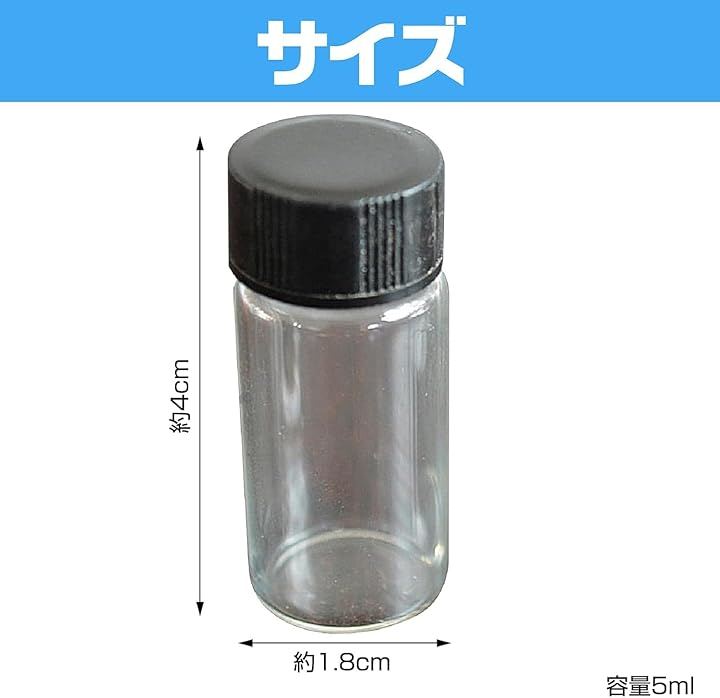 商品仕様:5ml容量、材質はボトル素材がホウケイ酸ガラス、蓋の材質がpp(ポリプロピレン)、ガスケット材質がpe(ポリエチレン)。