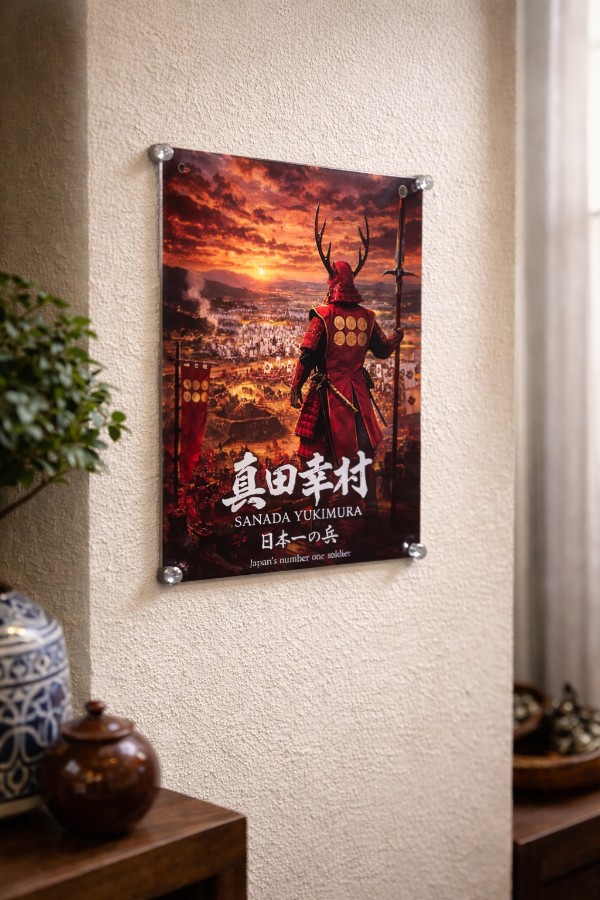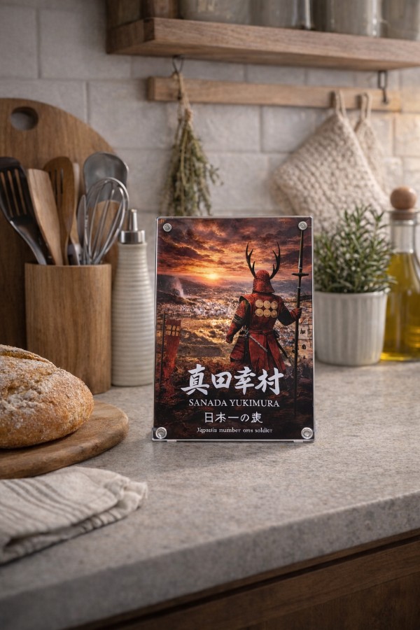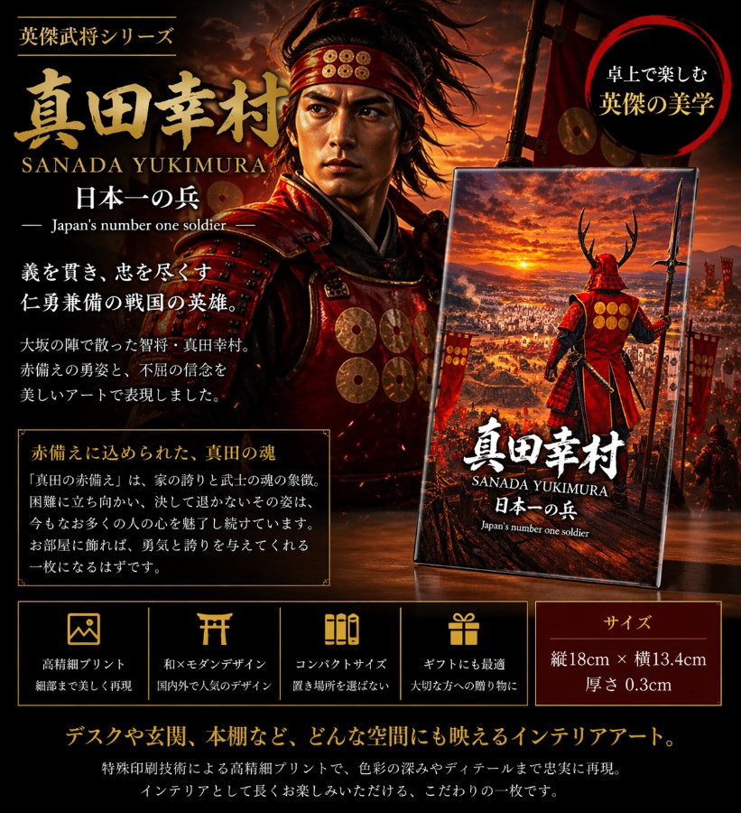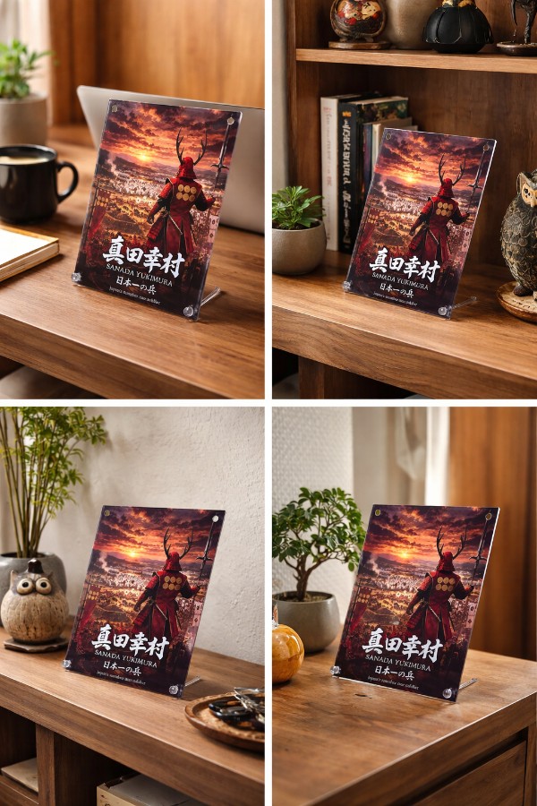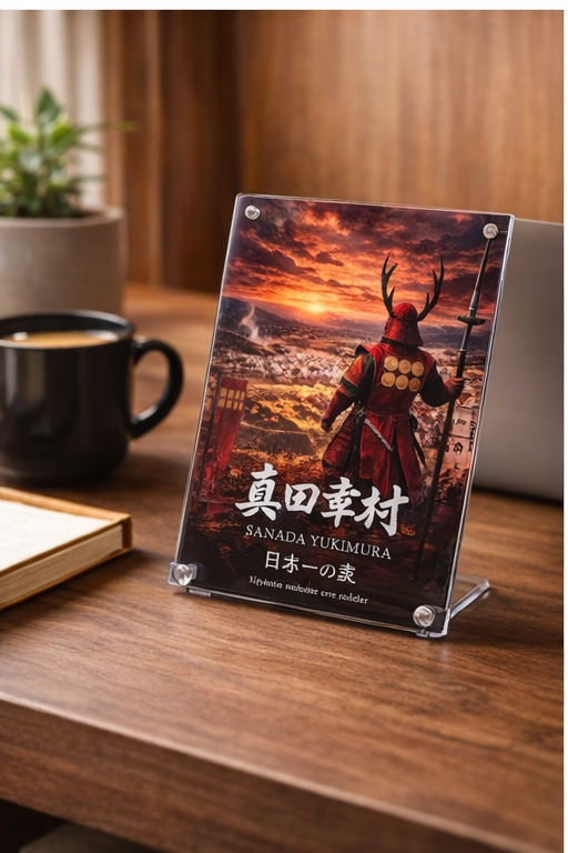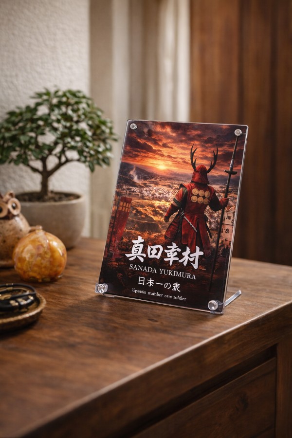 This is a tabletop display stand featuring Sanada Yukimura, one of Japan’s legendary samurai warriors.It combines Japanese samurai culture with modern AI art.Printed using inkjet printing to reproduce the detailed colors and atmosphere of the samurai AI artwork.Recommended for interior decoration, collections, and gifts for fans of Japanese culture.