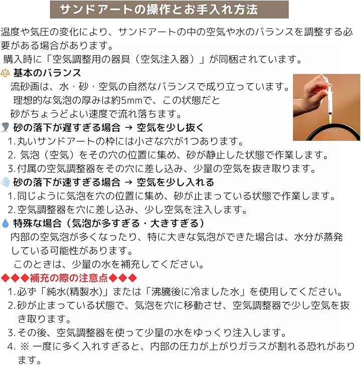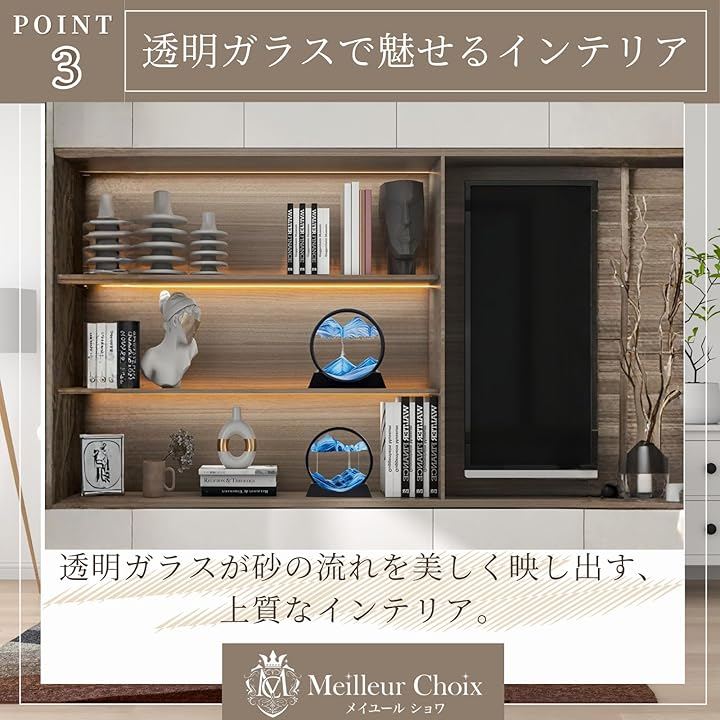 「透明ガラスで魅せるインテリア」 透明ガラスを採用し、繊細な砂の流れや層の変化を鮮明に楽しめます。