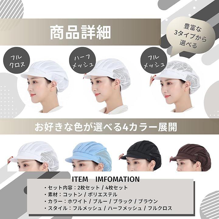 「商品詳細」サイズ:フリーサイズ(頭囲55~62cm) セット内容:2枚セット / 4枚セット 素材:コットン / ポリエステル カラー:ホワイト / ブルー / ブラック / ブラウン スタイル:フルメッシュ / ハーフメッシュ / フルクロス *製造時のにおいが気になる場合は、軽く洗濯してから風通しの良い場所で陰干ししていただくと、より快適にお使いいただけます。