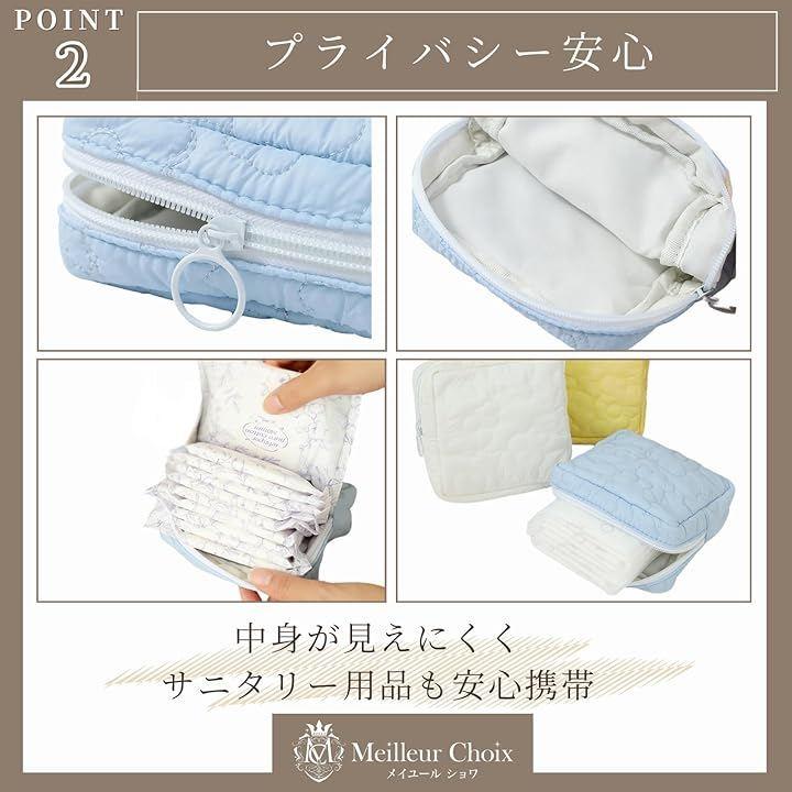 「プライバシー安心」 ファスナー付きで中身が見えにくく、サニタリー用品も周囲を気にせず持ち運び可能。