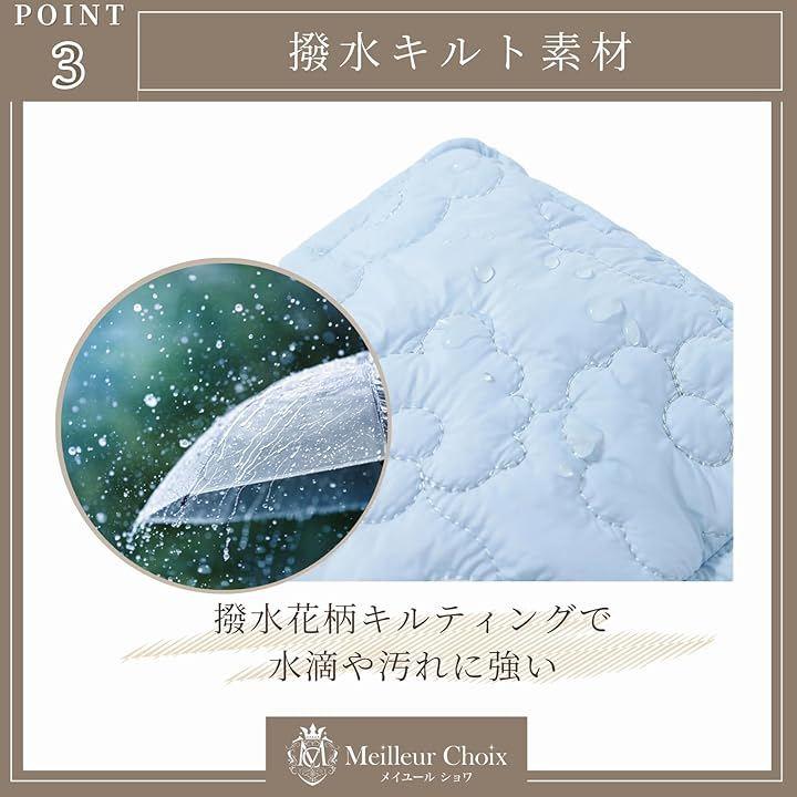 「撥水キルト素材」 撥水加工を施した花柄キルティング素材を採用し、雨や水滴から中身をしっかり保護。