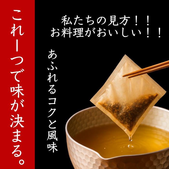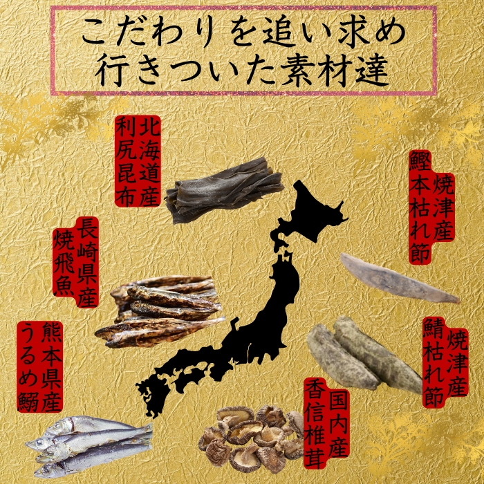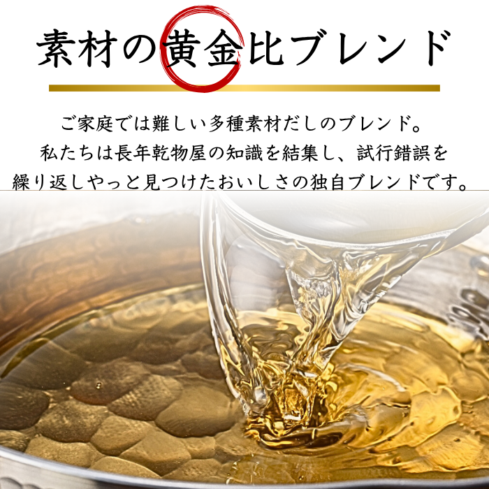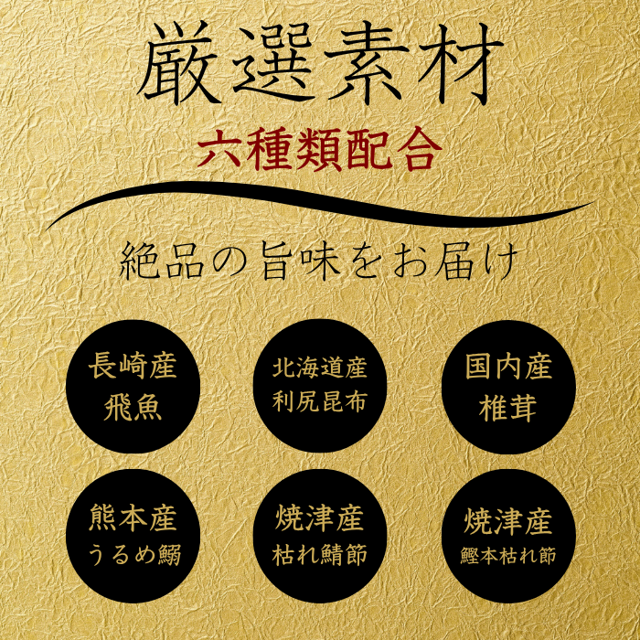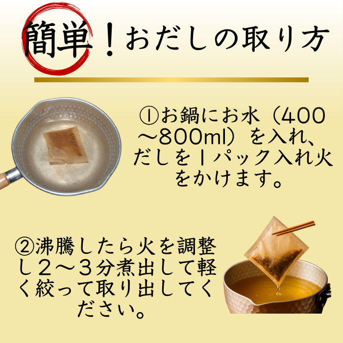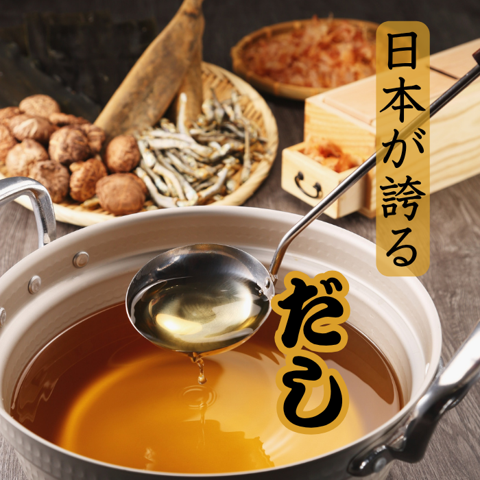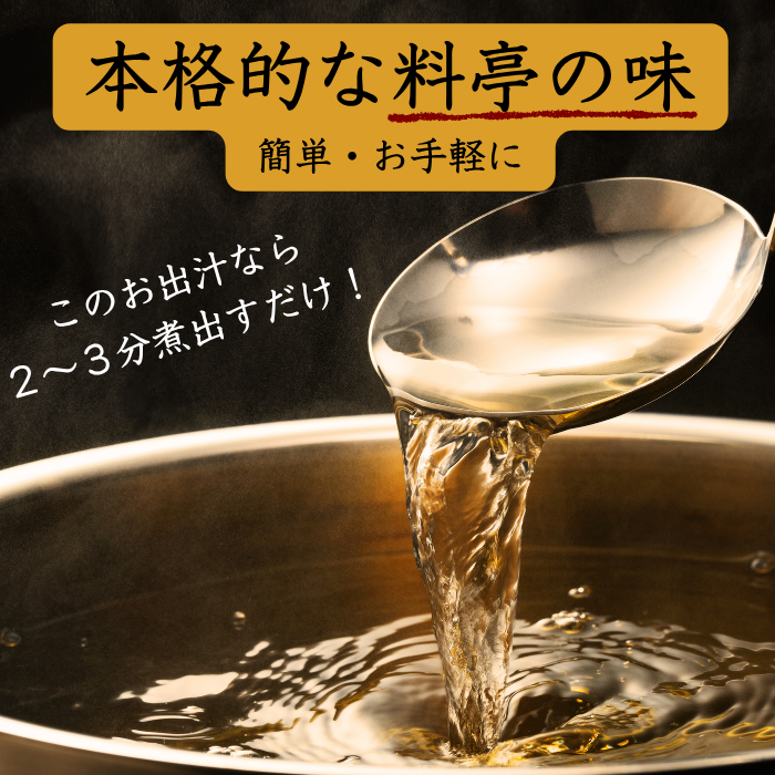国内産の飛魚、鰹節、昆布、椎茸等の厳選素材を使用。だしパックを入れ一煮立ちさせるだけで本格おだしが誰でも簡単にできます。