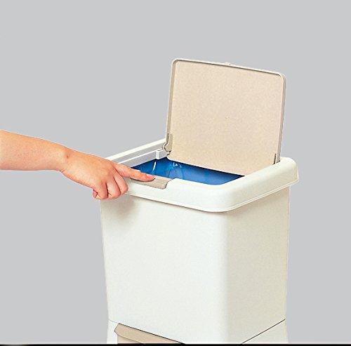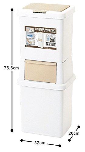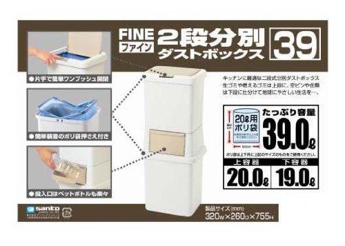 ■安心安全の日本製。 本体サイズ:幅32×奥行26×高さ75.5cm 本体重量:1.93kg 内容量:(上容器)21L、(下容器)19L 素材・材質:ポリプロピレン(PP) 生産国:日本 積み重ねて二分別できる省スペースダストボックス。上段はボタンを押してワンプッシュで開閉、下段は前開きタイプ。袋の装着がラクにできるポリ袋押さえ付き。安心安全の日本製。