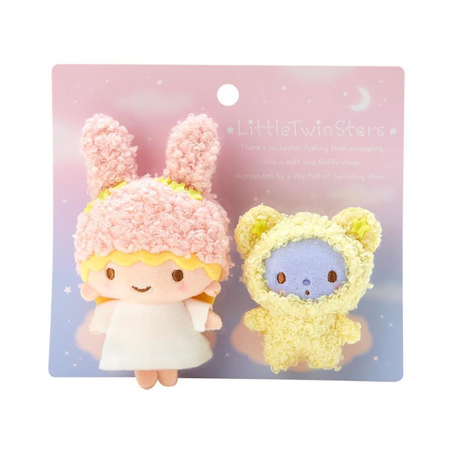お空の上でふわふわ雲に包まれて過ごすリトルツインスターズ ふわふわファンシーデザインシリーズ。もこもこのかぶりものを着たかわいいお友だちとのセット。バッグや帽子につけて、一緒にお出かけを楽しんで。