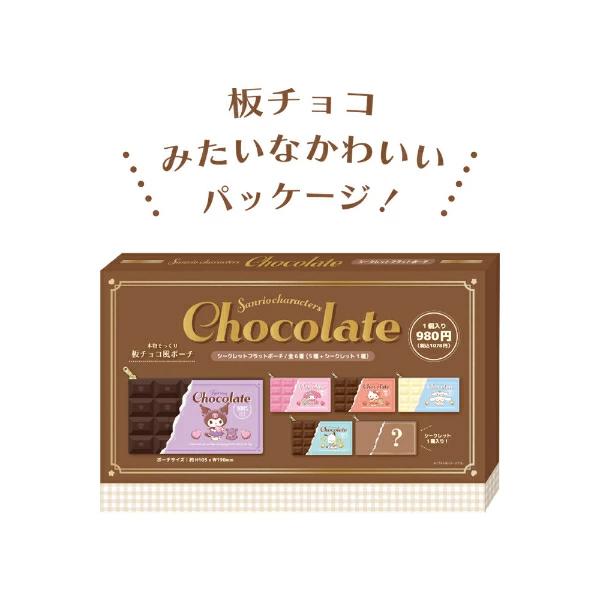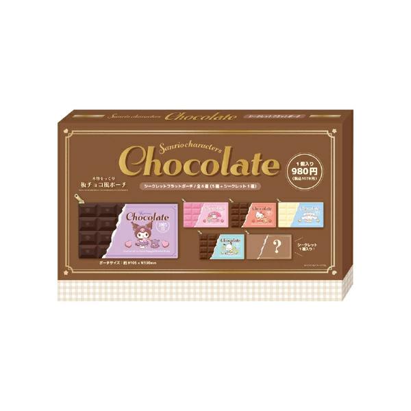 サンリオキャラクターズのシークレットフラットポーチ(チョコレート)のBOXセットです。全6種。本物みたいで美味しそう♪板チョコ風のデザインがとってもキュートなので持っているだけで気分も上がりそう~☆サンリオ好きなお友達と分け合っても◎シークレット入りなので開けるまでドキドキ&ワクワクが楽しめます♪