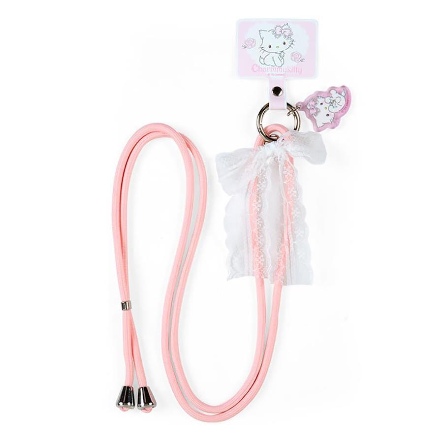 ウサハナ チャーミーキティ ぼんぼんりぼん 平成キャラクターリボンデザインシリーズ。チャーミーキティとおそろいのレースリボンがポイント。スマホをかわいく持ち歩けて、落とす心配もなくなっていいことづくめ。